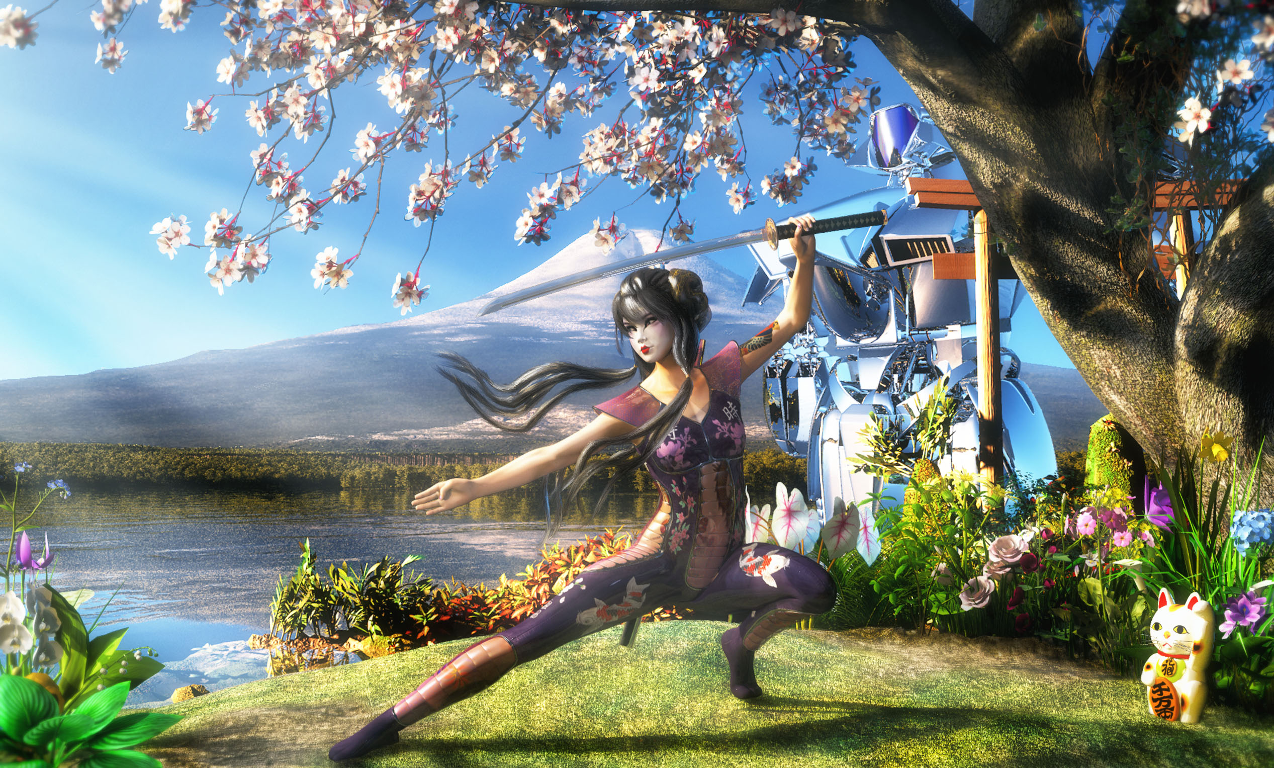 a mech samurai geisha lady, doing flexing martial arts exercises