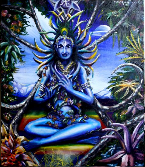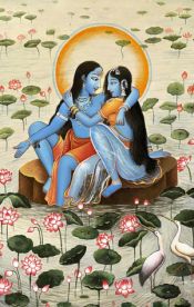 artwork, depicts Krishna travelling in a vehicle that looks like