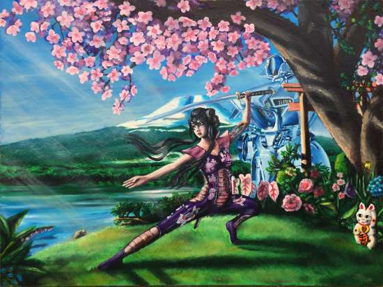 a mech samurai geisha lady, doing flexing martial arts exercises